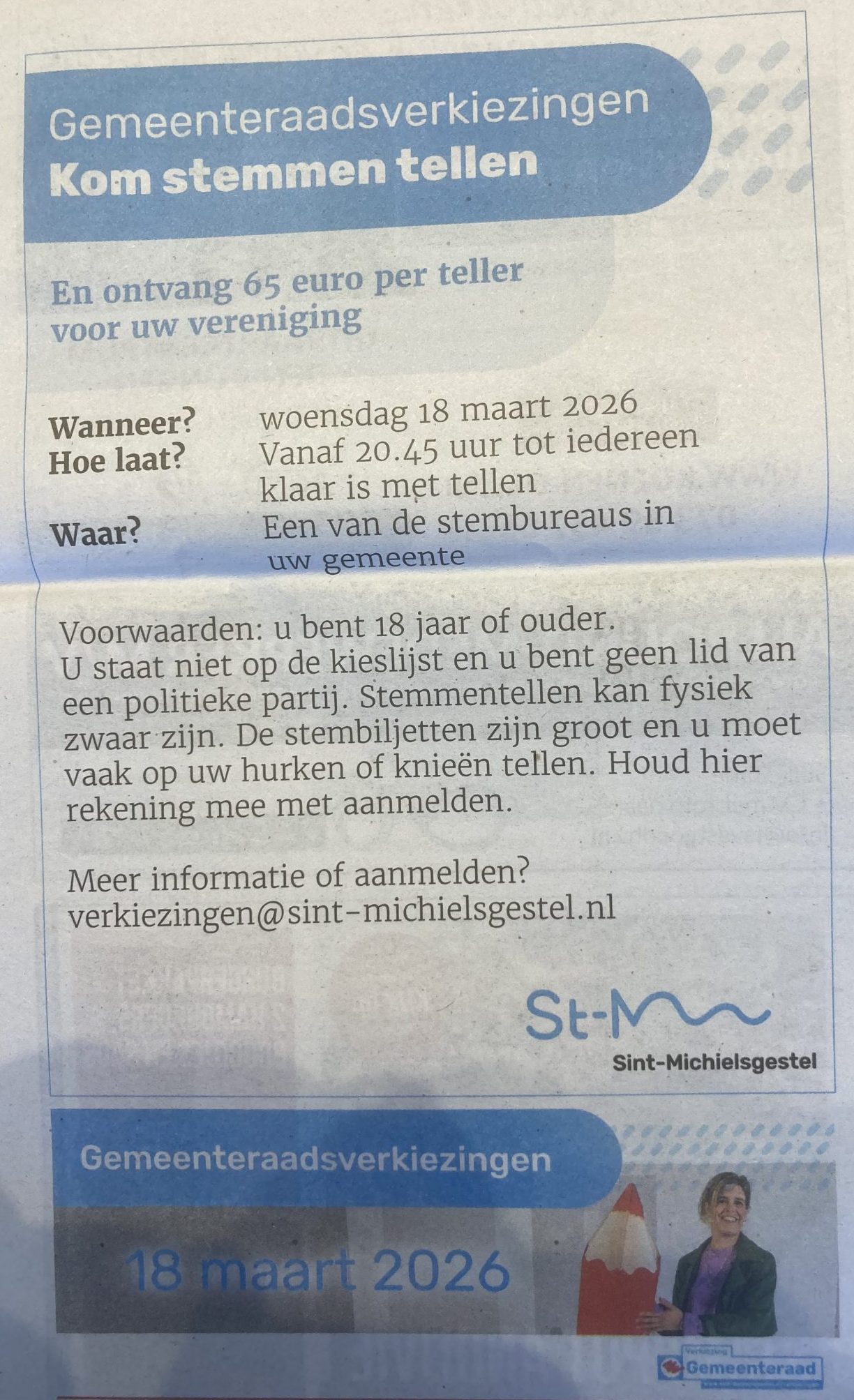Een avondje tellen en een mooi bedrag voor je team verdienen. En natuurlijk ook heel gezellig om het samen met je teamgenoten te doen. Wat je dan met het verdiende geld gaat doen is geheel aan jullie. Op 18 maart kun je stemmen komen tellen. Meld je als teamleden aan en stuur een mail naar: verkiezingen@sint-michielsgestel.nl.